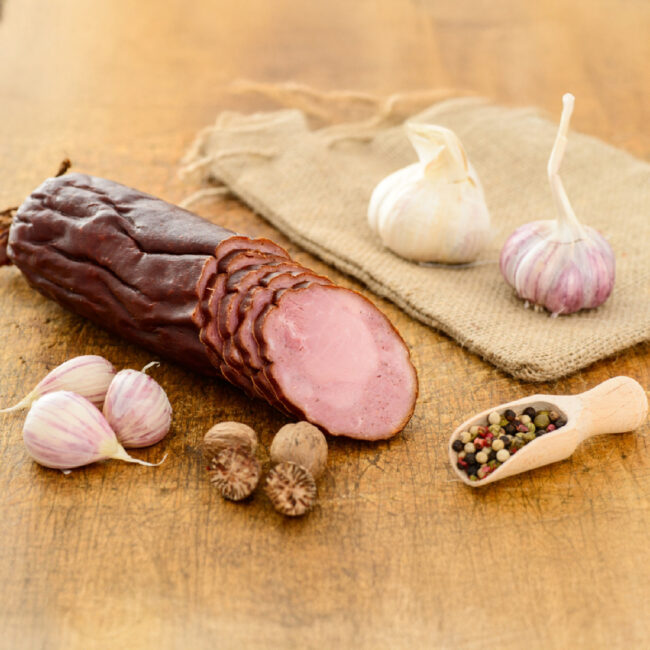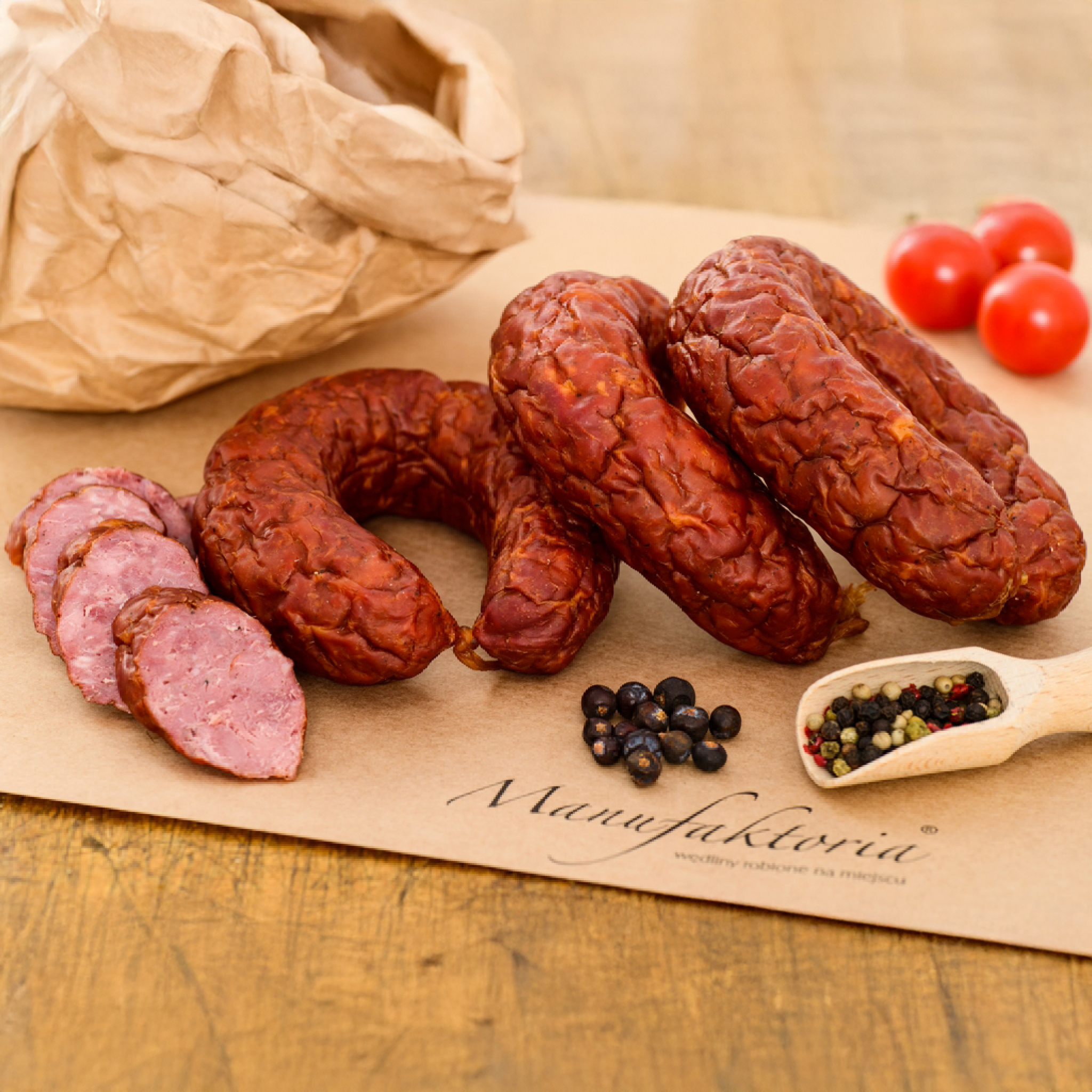 Kiełbasa jałowcowa wędzona to połączenie chudej, delikatnej wieprzowiny i szlachetnej wołowiny extra — duet, który tworzy smak idealny dla prawdziwych koneserów.