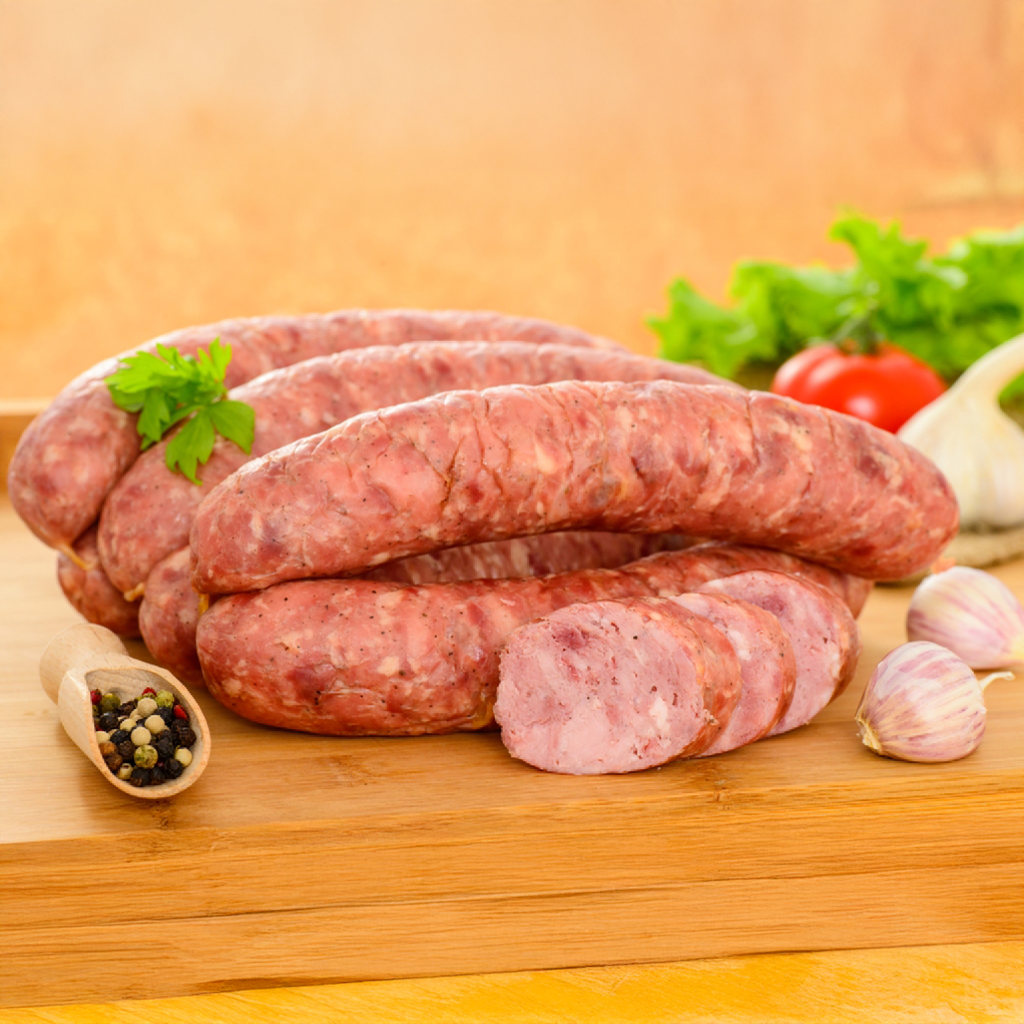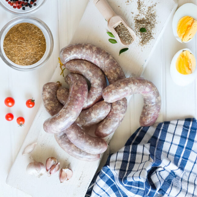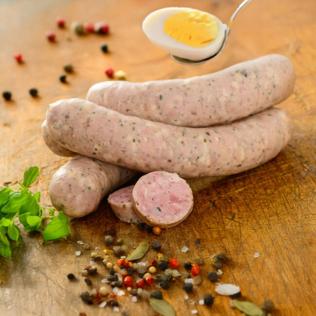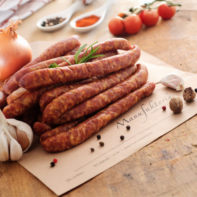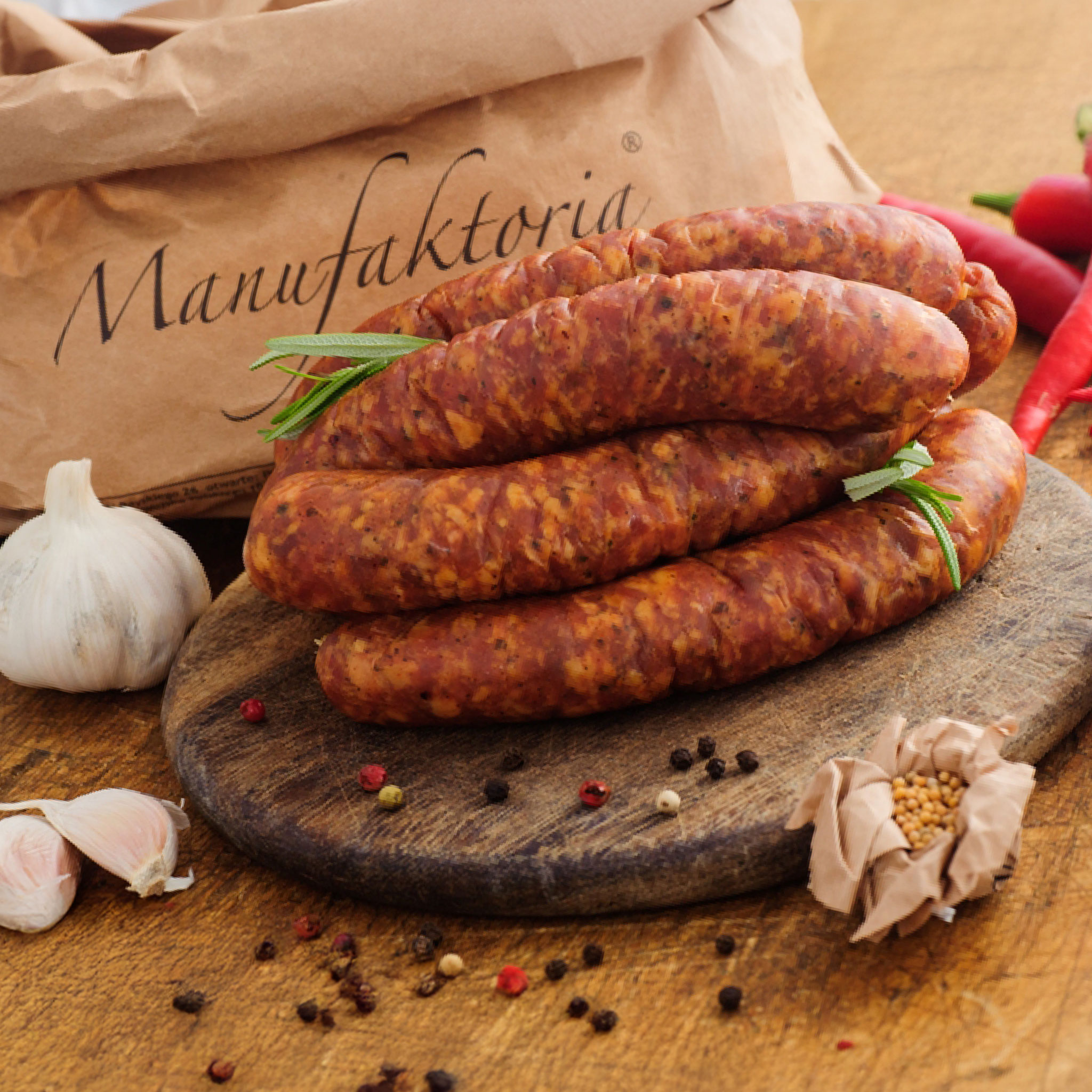 Białą kiełbasę surową w Manufaktorii przygotowujemy z wysokiej jakości mięsa wieprzowego, korzystając z tradycyjnych metod przekazywanych z pokolenia na pokolenie.