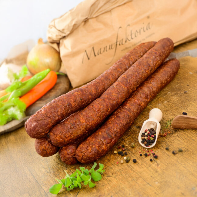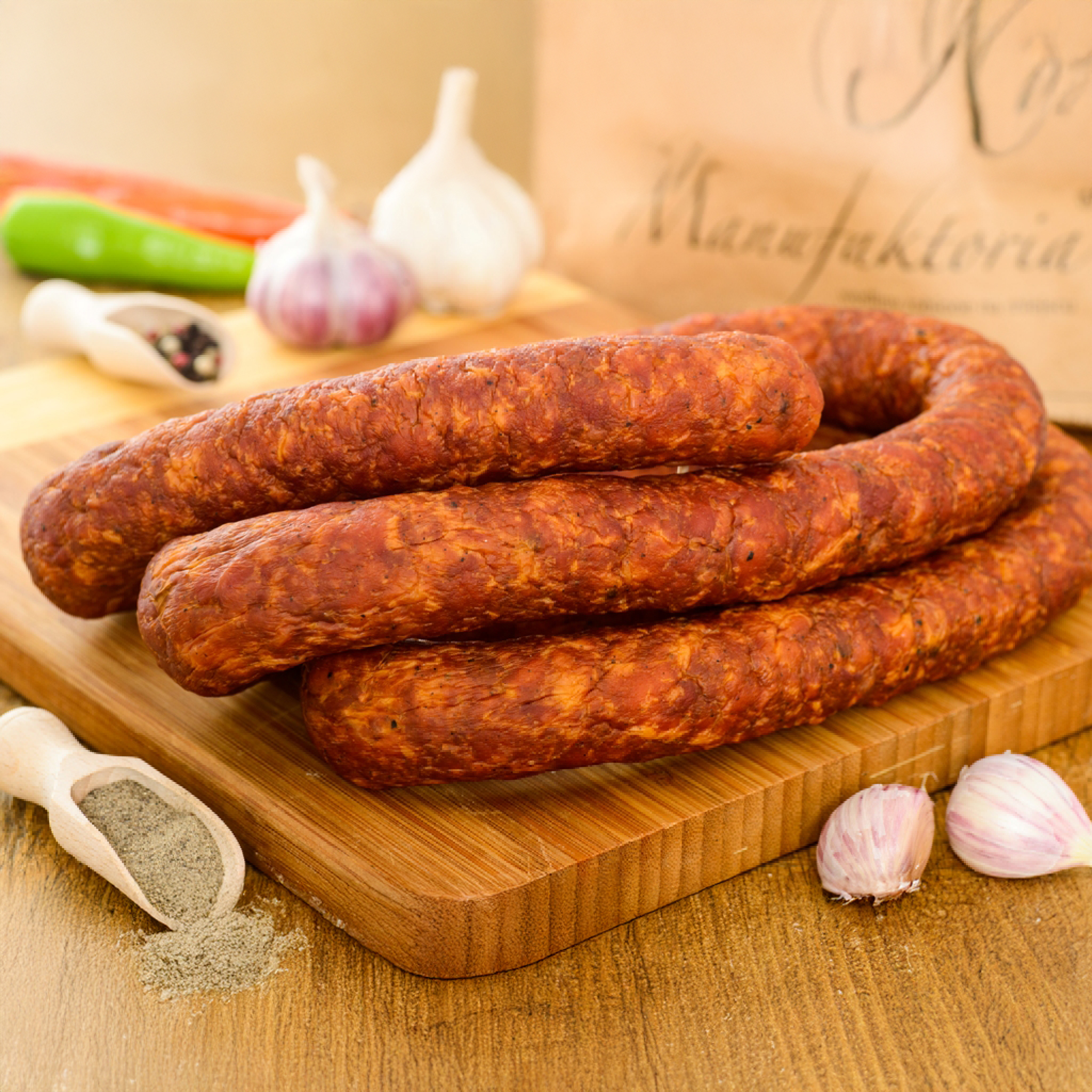 Kiełbasa Luksusowa to wyjątkowy wyrób, w którym delikatna, chuda wieprzowina spotyka się z kunsztem tradycyjnego wędzenia i powolnego podsuszania.