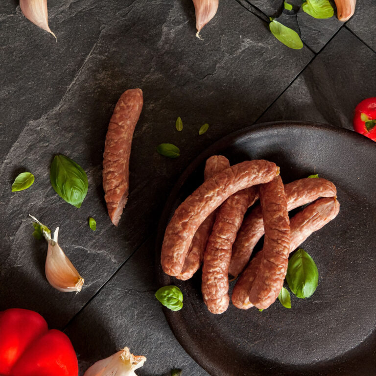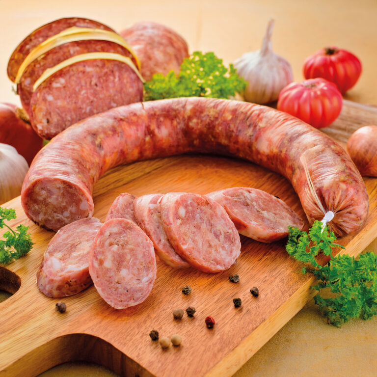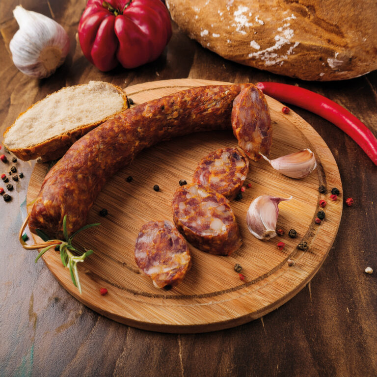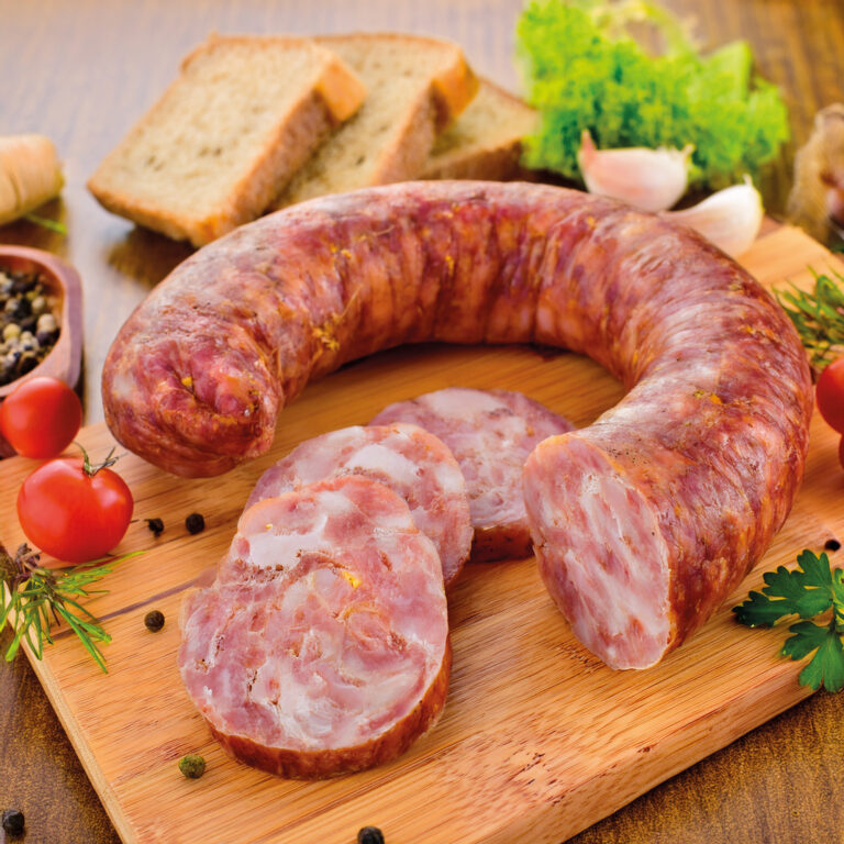 Wyrabiana jest z mieszanki chudej wieprzowiny oraz wysokogatunkowej wołowiny extra, która podkreśla jej głębię i nadaje szlachetnego wykończenia. Naturalne przyprawy, z dominującą nutą czosnku i pieprzu, tworzą harmonijny, tradycyjny profil smakowy.
