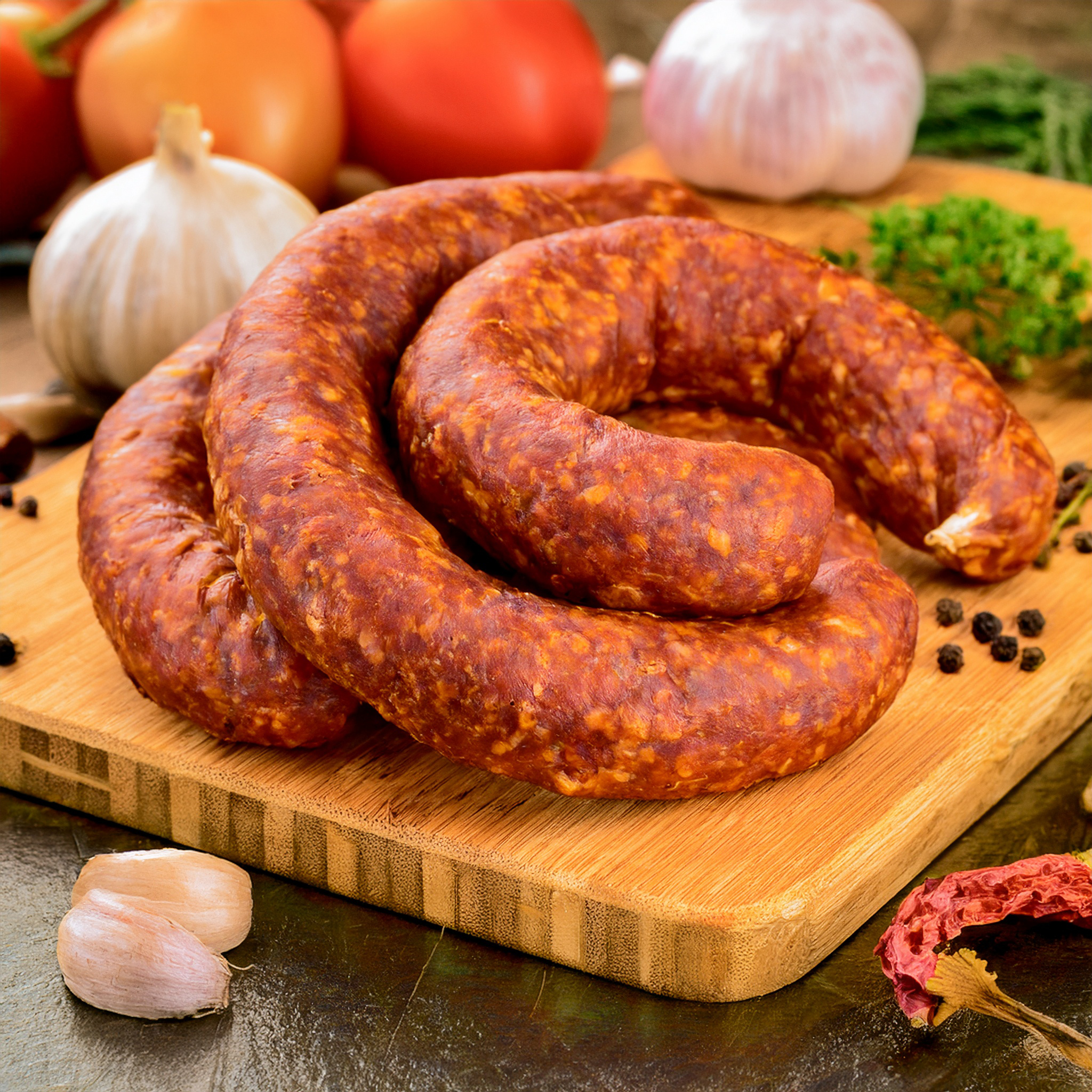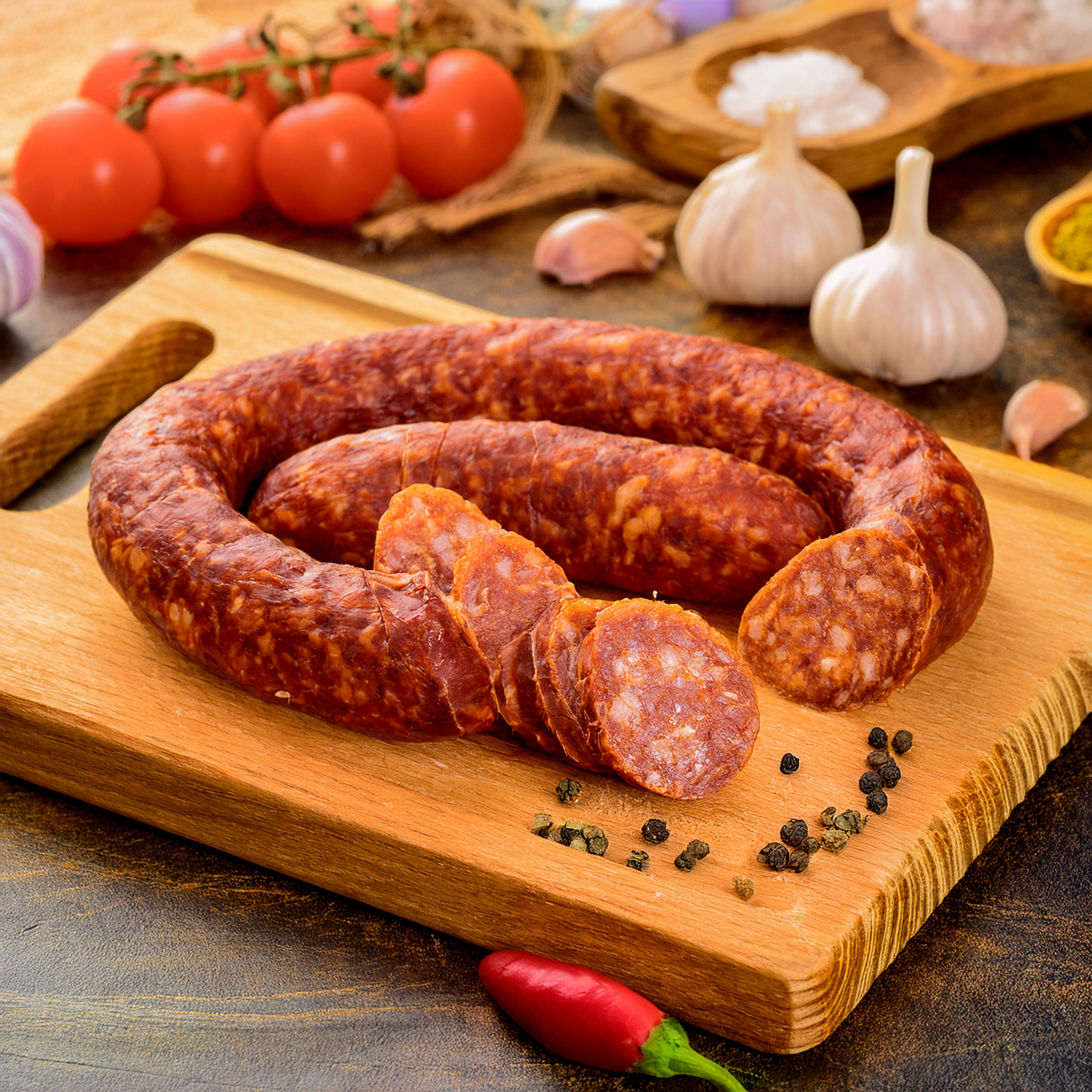To wyrób przygotowany głównie z chudej wieprzowiny, doprawiony wyłącznie naturalnie — solą i czosnkiem — zgodnie z oczekiwaniami najbardziej wymagających smakoszy.