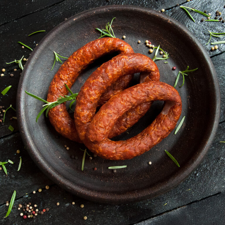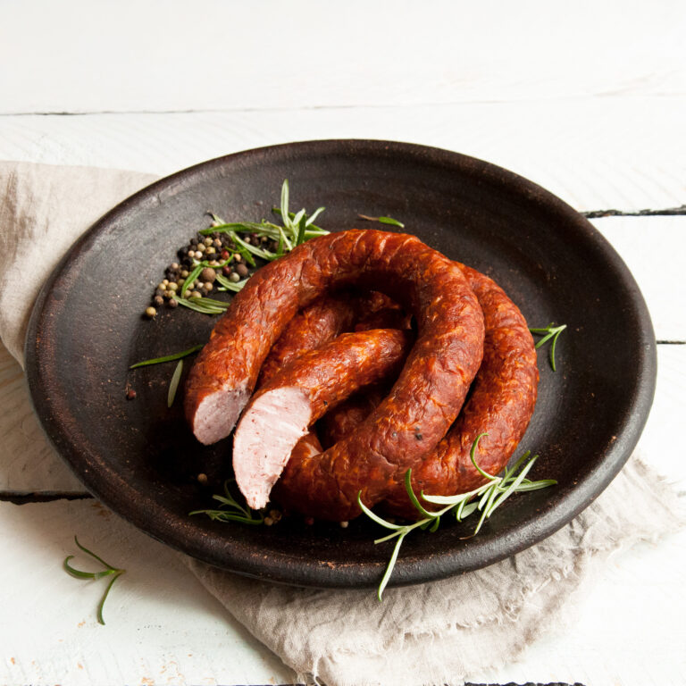 Kiełbasa Luksusowa to wyjątkowy wyrób, w którym delikatna, chuda wieprzowina spotyka się z kunsztem tradycyjnego wędzenia i powolnego podsuszania. Mięso uwędzone nad płonącymi szczapkami olchy nabiera szlachetnego aromatu, a proces posuszania nadaje kiełbasie elegancką kruchość i intensywny smak.