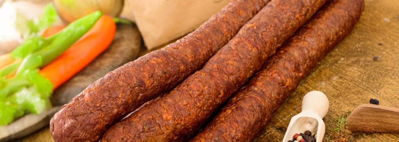 Nasza kiełbasa wykwintna to wędlina wysokiej jakości, wędzona i podsuszana, przygotowywana z najlepszych gatunków mięsa. Charakteryzuje ją intensywny aromat wędzenia dymem olchowym, naturalna osłona, bogaty zestaw tradycyjnych przypraw — czosnek, majeranek — oraz krucha, sprężysta konsystencja, idealna na deskę wędlin.